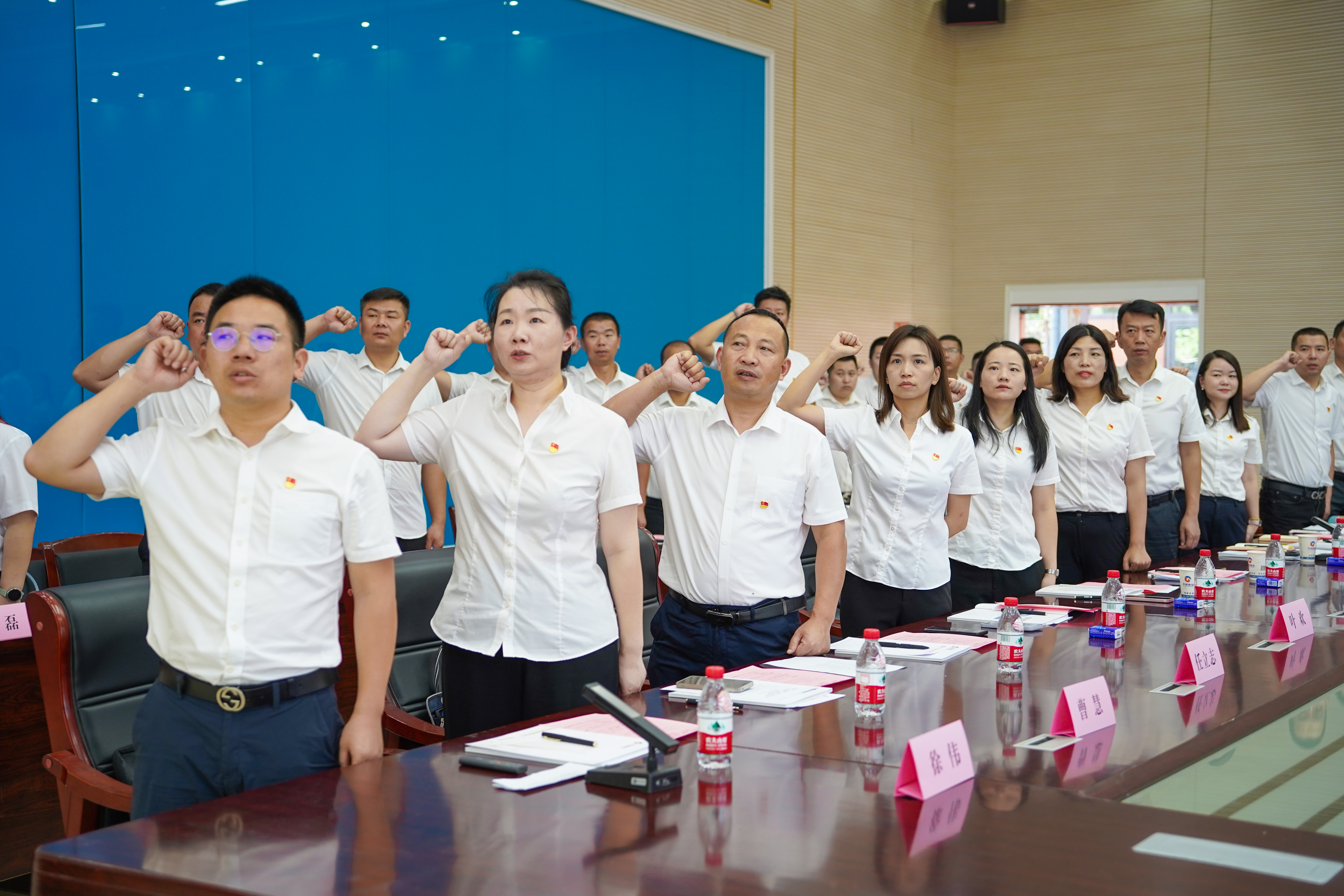 全體黨員肅立,奏唱國歌。劉吉祥同志領誓,重溫入黨誓詞。